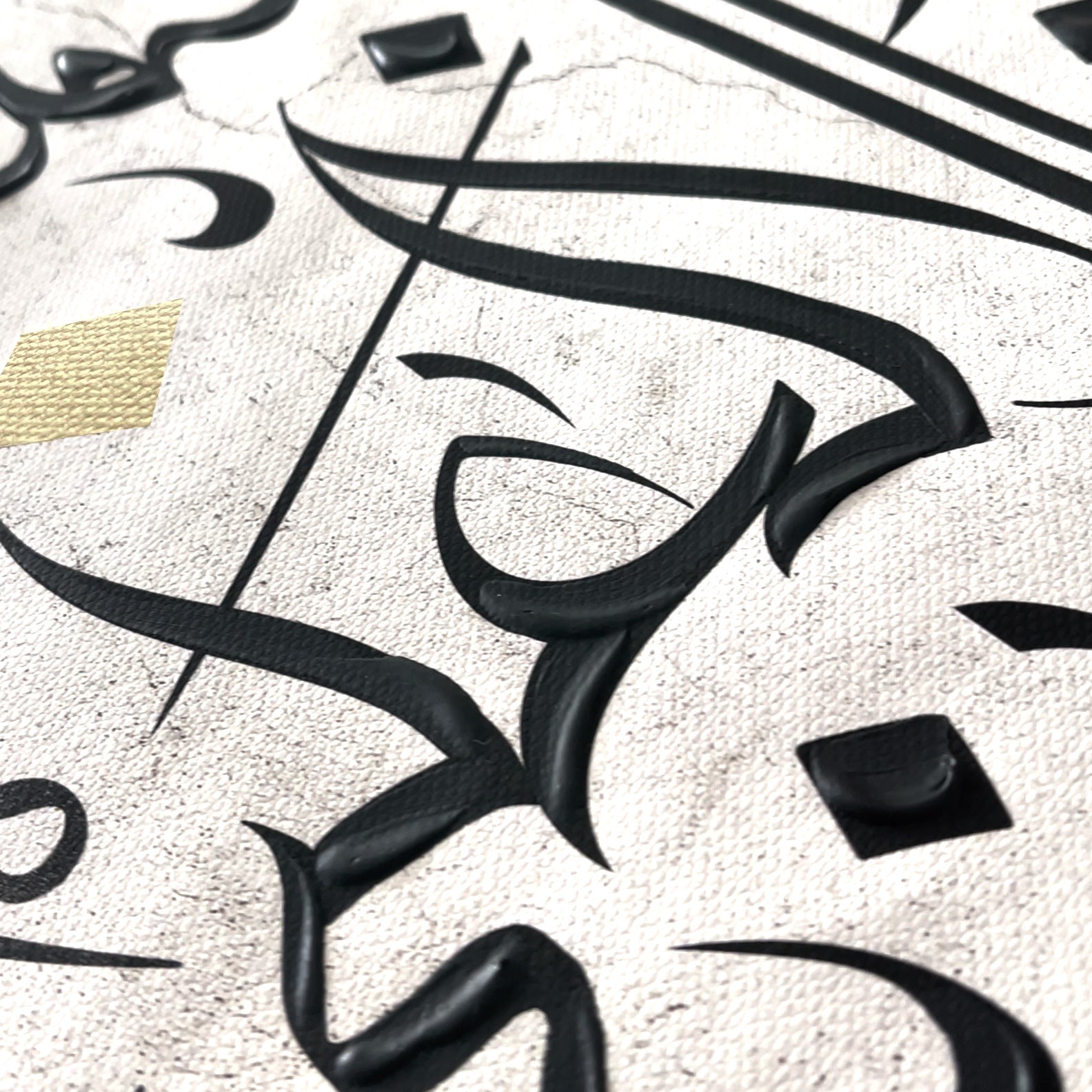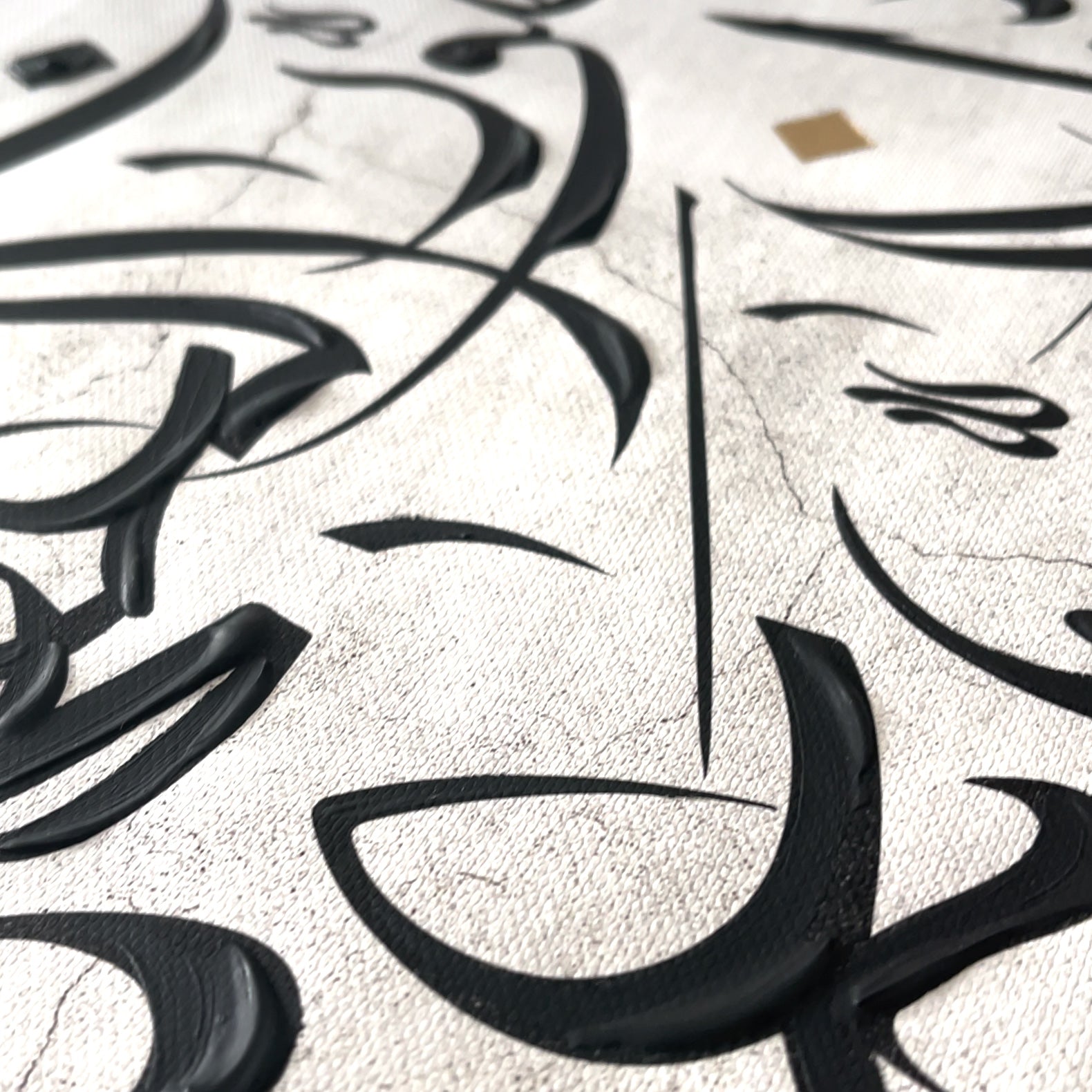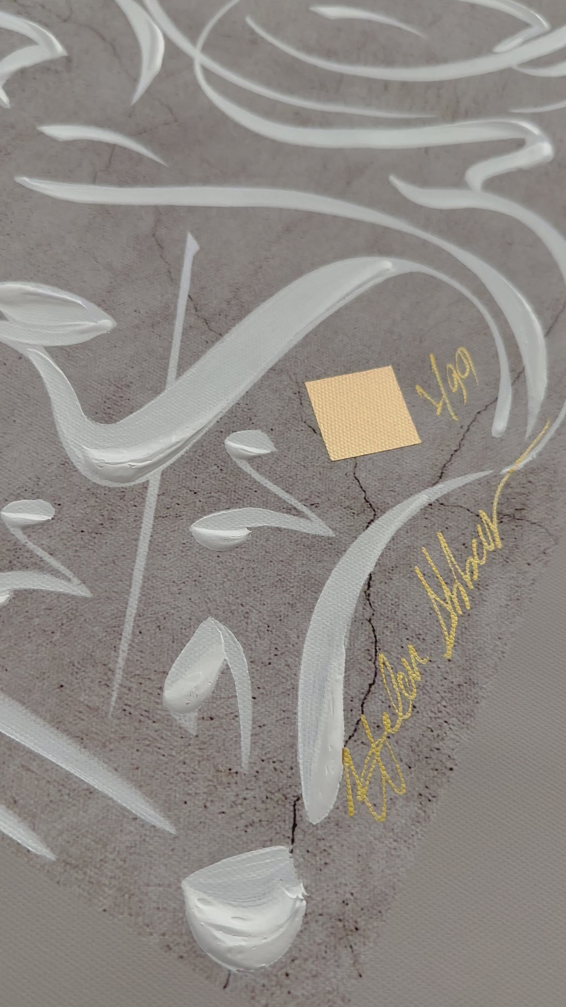 Bold and visually arresting, the artwork use hand-crafted script in beautiful swathes and confident strokes. On these canvases, hand applied gold ink overlays provide a rich embellishment. With an eye to both tradition and modernity.