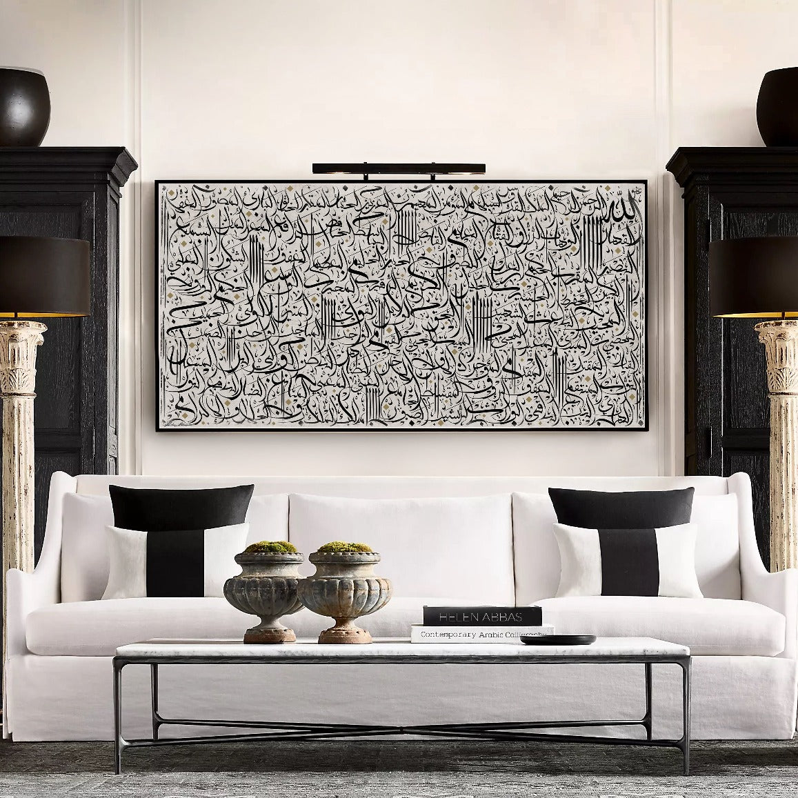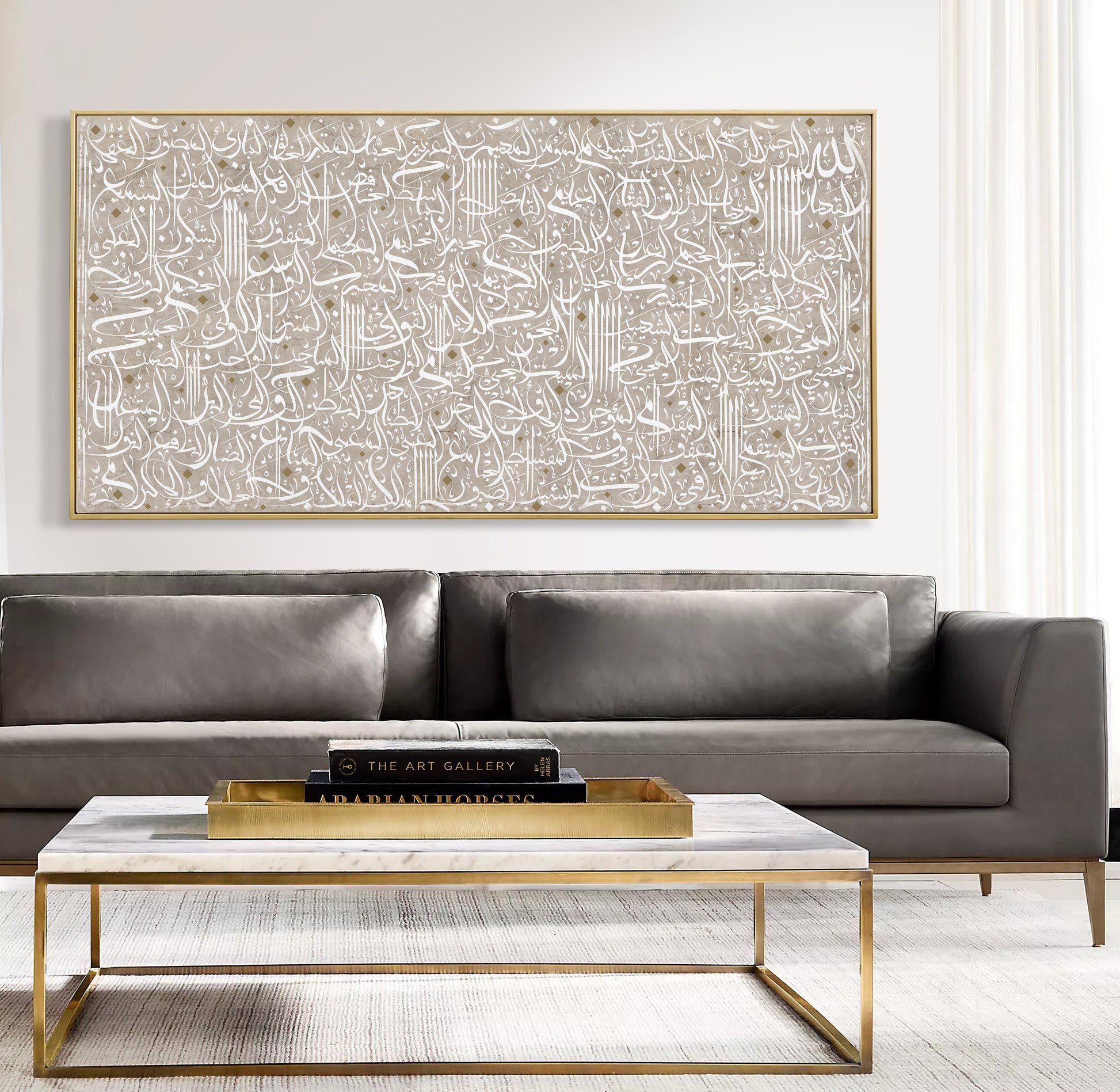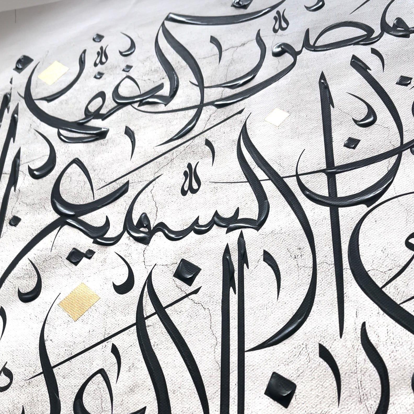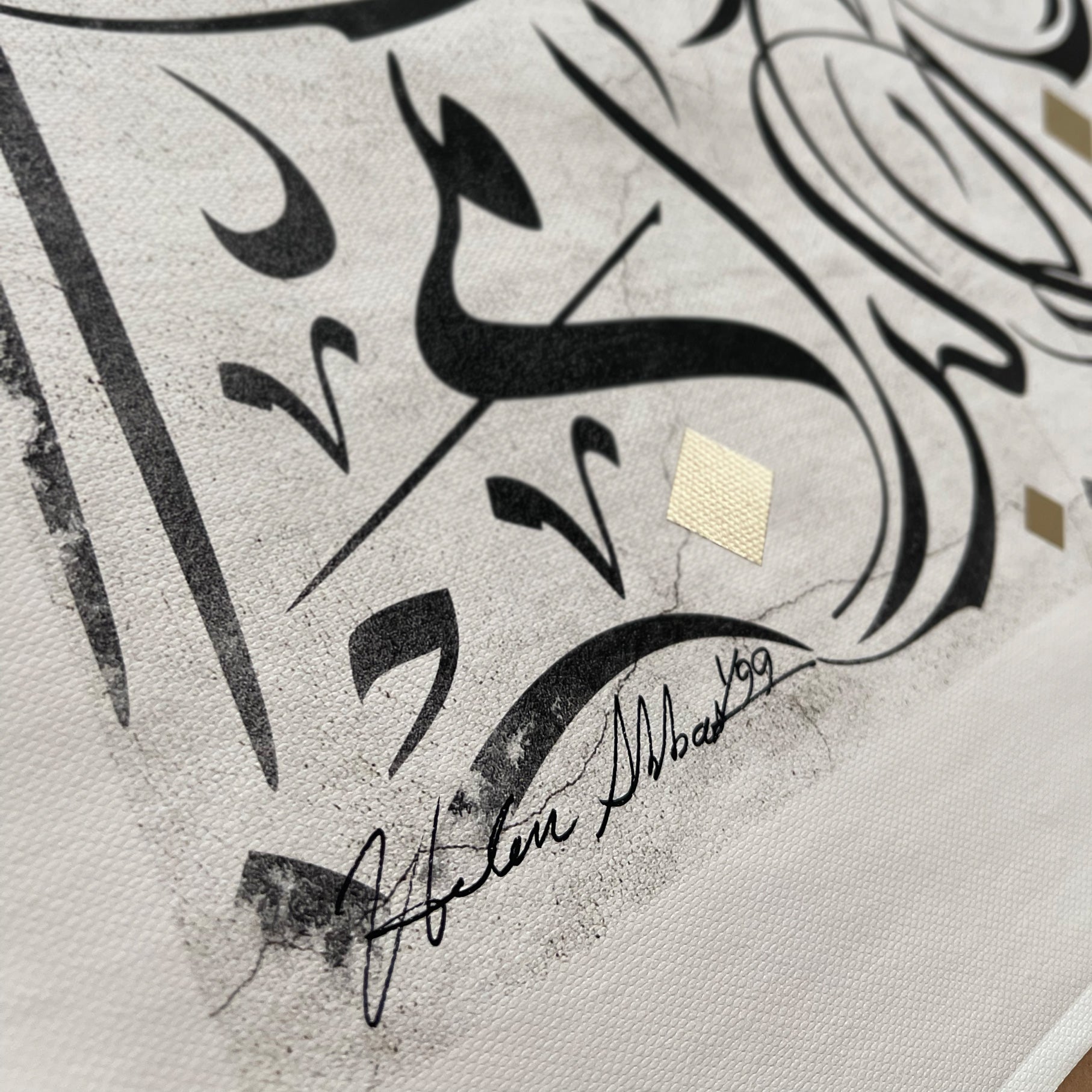 Bold and visually arresting, the artwork use hand-crafted script in beautiful swathes and confident strokes. On these canvases, hand applied gold ink overlays provide a rich embellishment. With an eye to both tradition and modernity.