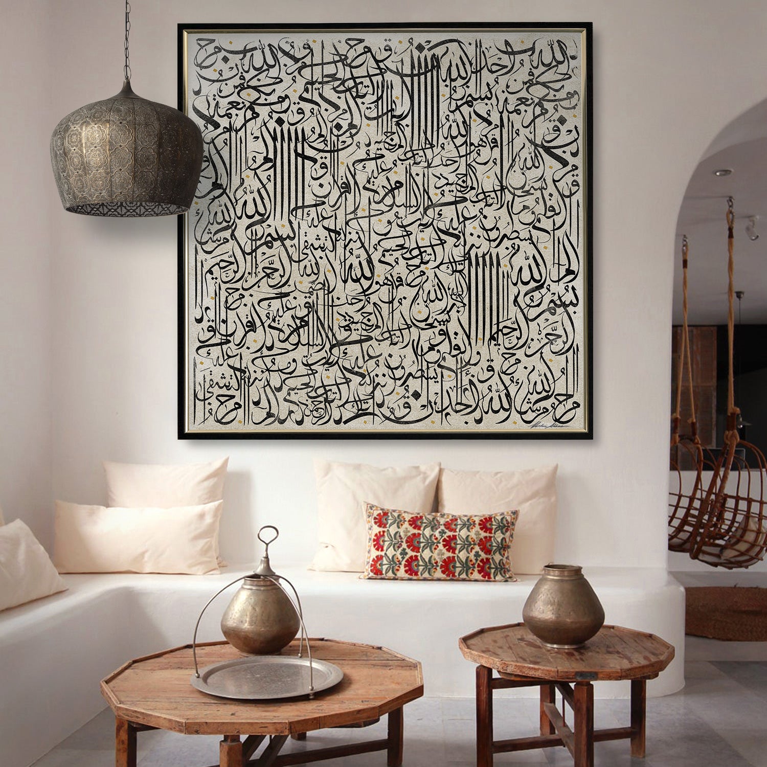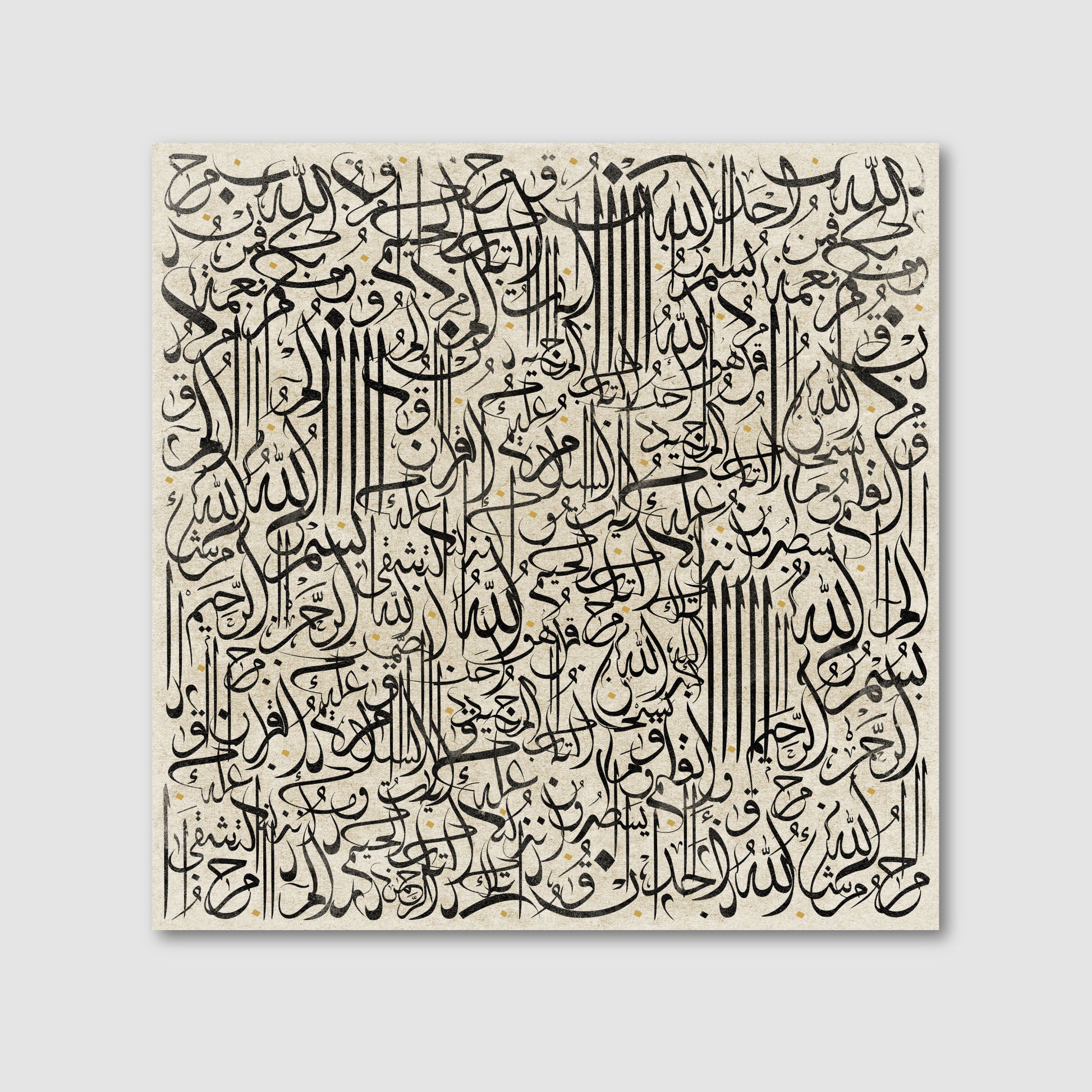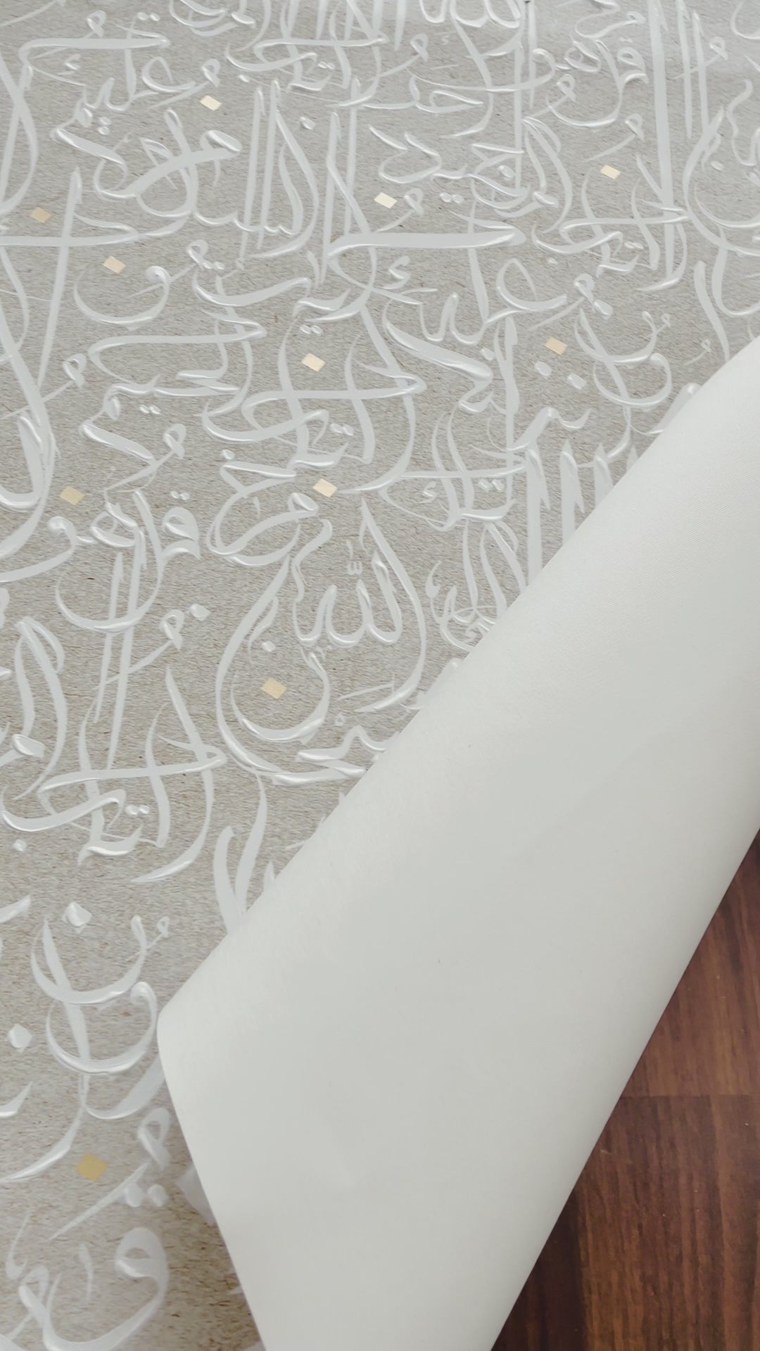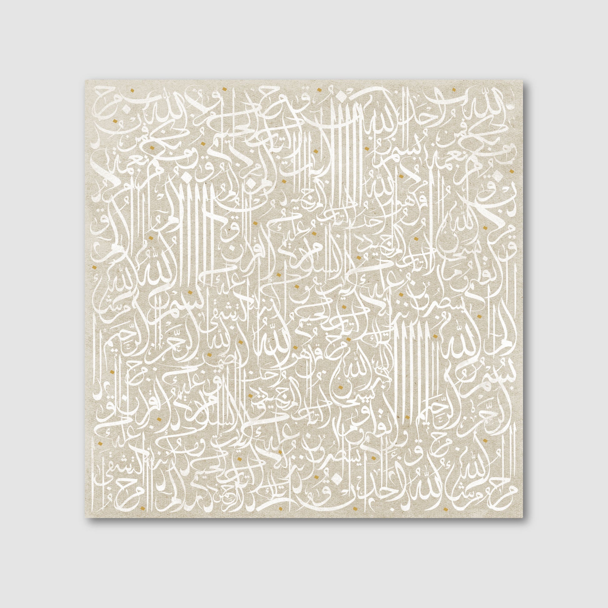 Hand painted thick Calligraphy on digital printed background. Helen Abbas explores the intricacies of contemporary Arabic calligraphy against a backdrop of vintage shades and texture.